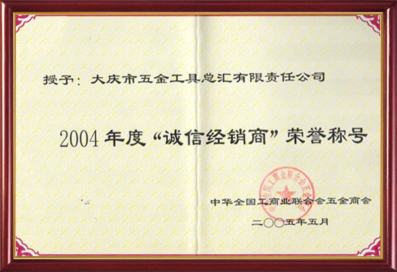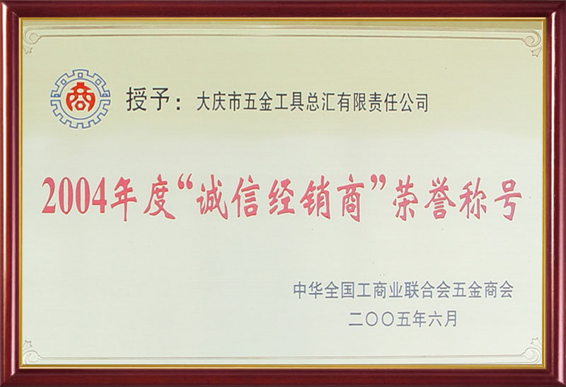 2004年度中華全國工商業(yè)聯(lián)合會(huì)五金機(jī)電商會(huì)授予“誠信經(jīng)銷商”榮譽(yù)稱號(hào)