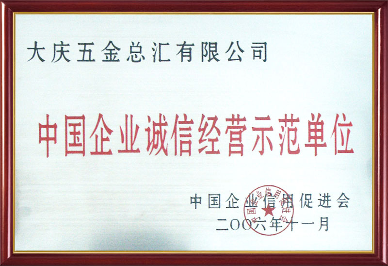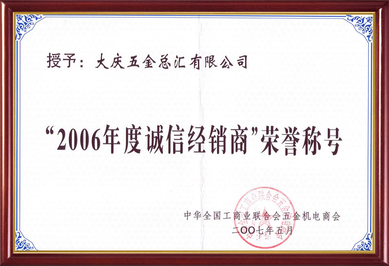 2006年度中華全國工商業(yè)聯(lián)合會(huì)五金機(jī)電商會(huì)授予“誠信經(jīng)銷商”榮譽(yù)稱號(hào)