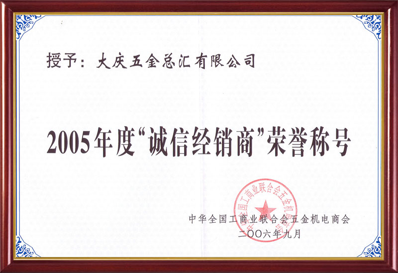 2005年度中華全國工商業(yè)聯(lián)合會(huì)五金機(jī)電商會(huì)授予“誠信經(jīng)銷商”榮譽(yù)稱號(hào)