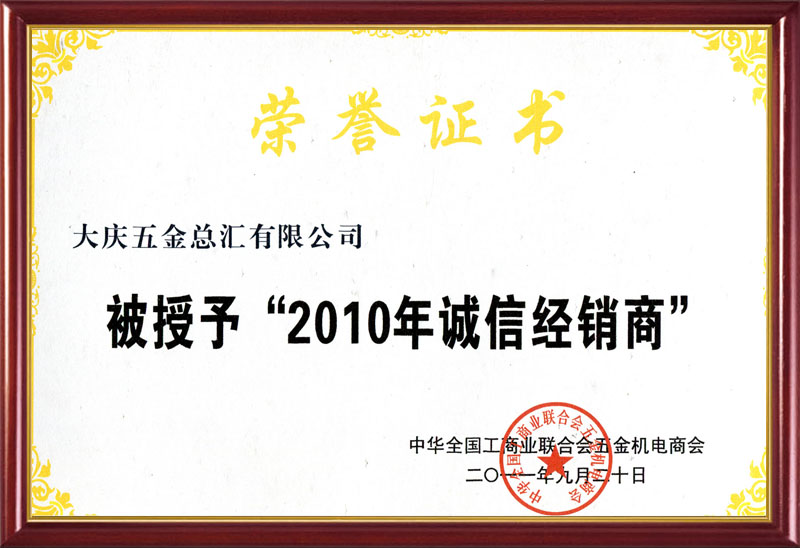 2010年度中華全國工商業(yè)聯(lián)合會(huì)五金機(jī)電商會(huì)授予“誠信經(jīng)銷商”榮譽(yù)稱號(hào)
