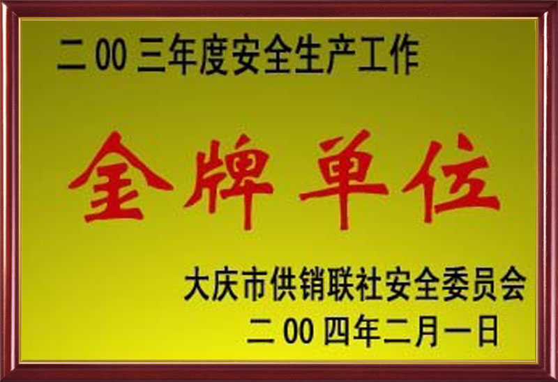大慶市供銷聯(lián)社安全委員會2003年度安全生產(chǎn)工作金牌單位