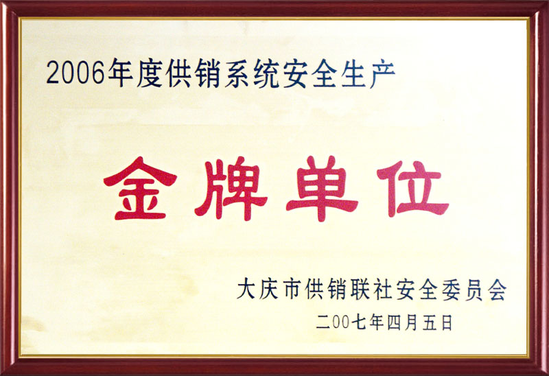 大慶市供銷聯(lián)社安全委員會2006年度供銷系統(tǒng)安全生產(chǎn)工作金牌單位