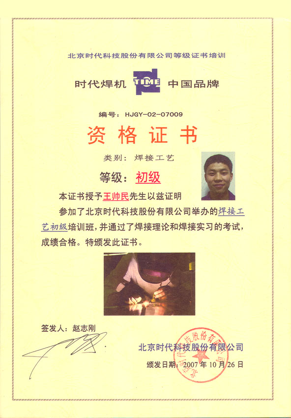 2007年10月,我公司焊接部員工王帥民參加了時代公司舉辦的焊接工藝培訓。通過這次的培訓,使王帥民同志重點掌握了焊接電源的工作原理、CO2氣保焊 的特點、氬弧焊的特點、手工焊的特點、埋弧焊的特點并親自對各種焊接進行實踐操作。最終以優(yōu)異的成績,獲得了資格證書。