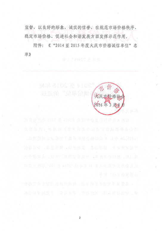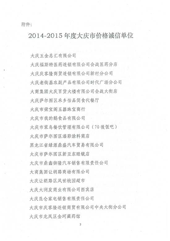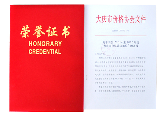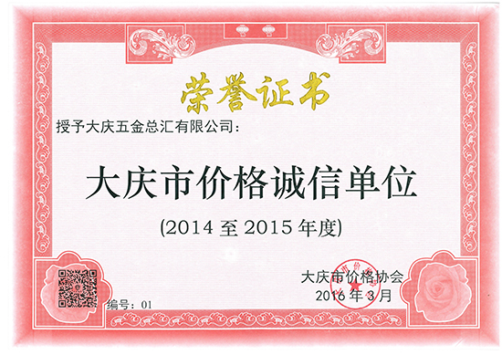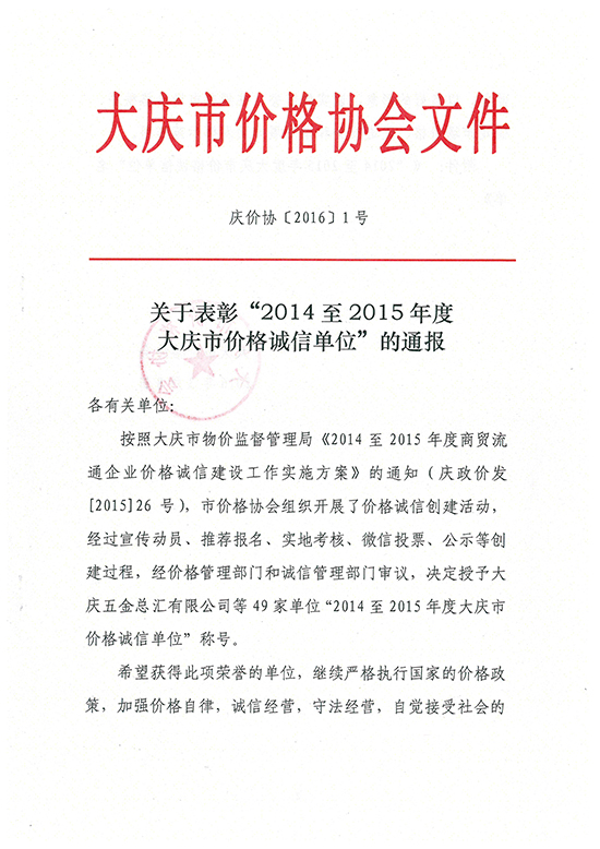 2016年五金總匯再次獲得“大慶市價(jià)格誠信單位”榮譽(yù)稱號(hào)