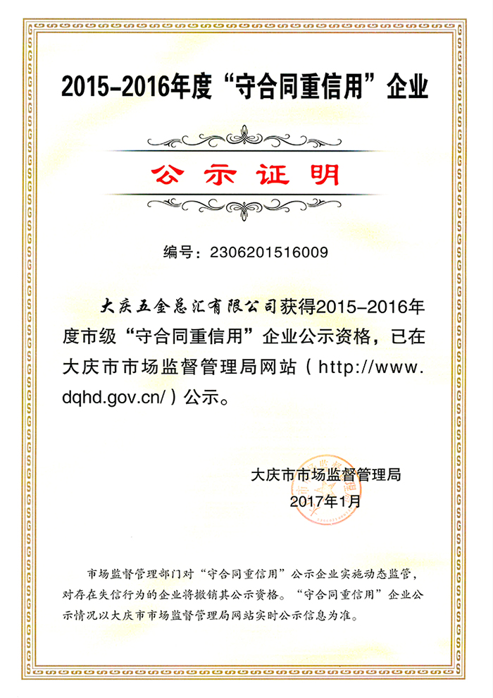 2017年2月21日,從市場監(jiān)督管理局獲悉,大慶五金總匯有限公司憑借完善的誠信體系和多年的誠信經(jīng)營,被評定為2015—2016年度市級“守合同重信用”企業(yè)。已在大慶市市場監(jiān)督管理局網(wǎng)站(http://www.dqhd.gov.cn/)公示。
