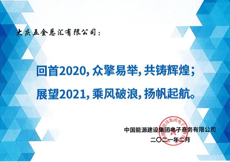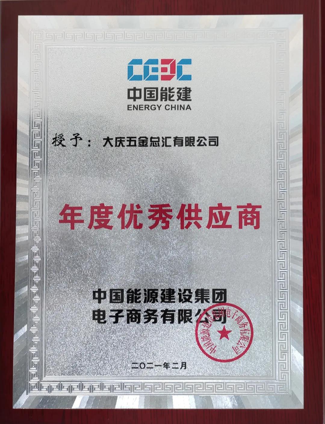 2021年2月,由中國能源建設(shè)集團(tuán)電子商務(wù)有限公司(以下簡稱中能建)舉辦的2020年度優(yōu)秀供應(yīng)商評選活動在天津順利召開。經(jīng)過專家的評審,以及一年來對供應(yīng)商供貨能力的考察,結(jié)合客戶的高度認(rèn)可,大慶五金總匯有限公司獲得“2020年度優(yōu)秀供應(yīng)商”榮譽稱號,這是繼2019年度第二次獲得該獎項。