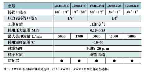 1.型號:AW200,AW300,AW400,AW500,AW600 2.接管口徑:G1/8~1 3.使用壓力范圍:0.15-0.85Mpa