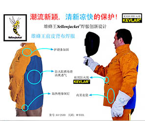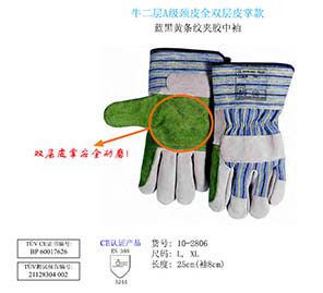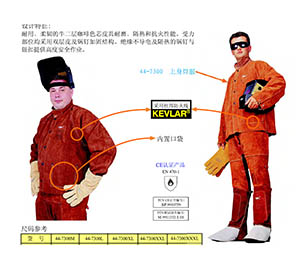 長(zhǎng)度為34cm, 外層采用耐磨、舒適柔軟及高性能隔熱效果的牛二層頸皮制成。采用杜邦Kevlar 防火線縫制。加上內(nèi)層全套里設(shè)計(jì),增強(qiáng)舒適感。直拇指增加護(hù)縫層設(shè)計(jì),提高手套的使用率。
