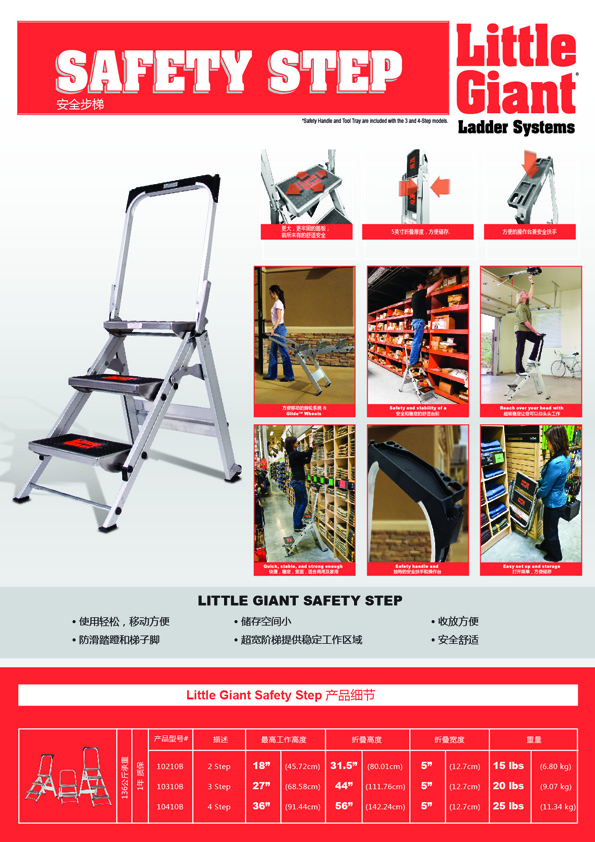 使用輕松,移動方便。儲存空間小。收放方便,防滑踏蹬和梯子腳。超寬梯階提供穩(wěn)定工作臺面。安全舒適。