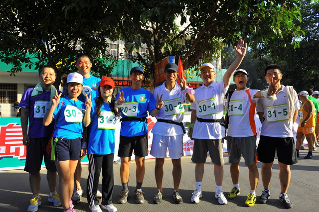 11月5日,秋陽燦爛,大家早已躍躍欲試,隊(duì)中負(fù)責(zé)后勤的我,早在比賽前夕就廣發(fā)注意帖:速干短褲、帽子、腰包、水杯、小方巾、鞋子等物品需必備;作為隊(duì)伍領(lǐng)頭雁的齊總則早已咨詢專業(yè)選手,提倡大家結(jié)合自己體力準(zhǔn)備能量棒、巧克力等緊急能量品;隊(duì)長鄧總在了解路線和路況后,制定了“穩(wěn)重取勝”的戰(zhàn)略,采取了“準(zhǔn)備活動做充足,先慢后快求適應(yīng),不因外因亂陣腳,敵疲我追求成績”的具體戰(zhàn)術(shù);隊(duì)伍中的另一名隊(duì)員則帶來了他專業(yè)的GPS定位手表,分時段匯報(bào)所走路程、當(dāng)前速度適當(dāng)與否,并提前告知提速準(zhǔn)備;我們的女隊(duì)友亞梅,則一路保持微笑,緊跟隊(duì)伍,偶爾爆出的一些冷笑話,讓緊張趕路的我們倍感清爽。
