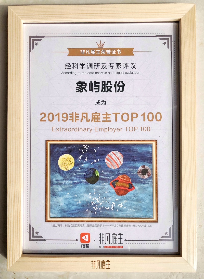 12月13日,由國內(nèi)精英職業(yè)發(fā)展平臺獵聘網(wǎng)主辦的2019非凡雇主“非凡之夜頒獎(jiǎng)盛典”在廣州舉行。象嶼股份從上萬余家企業(yè)中脫穎而出,入選“2019非凡雇主TOP 100” 及“2019福建變革非凡雇主”。