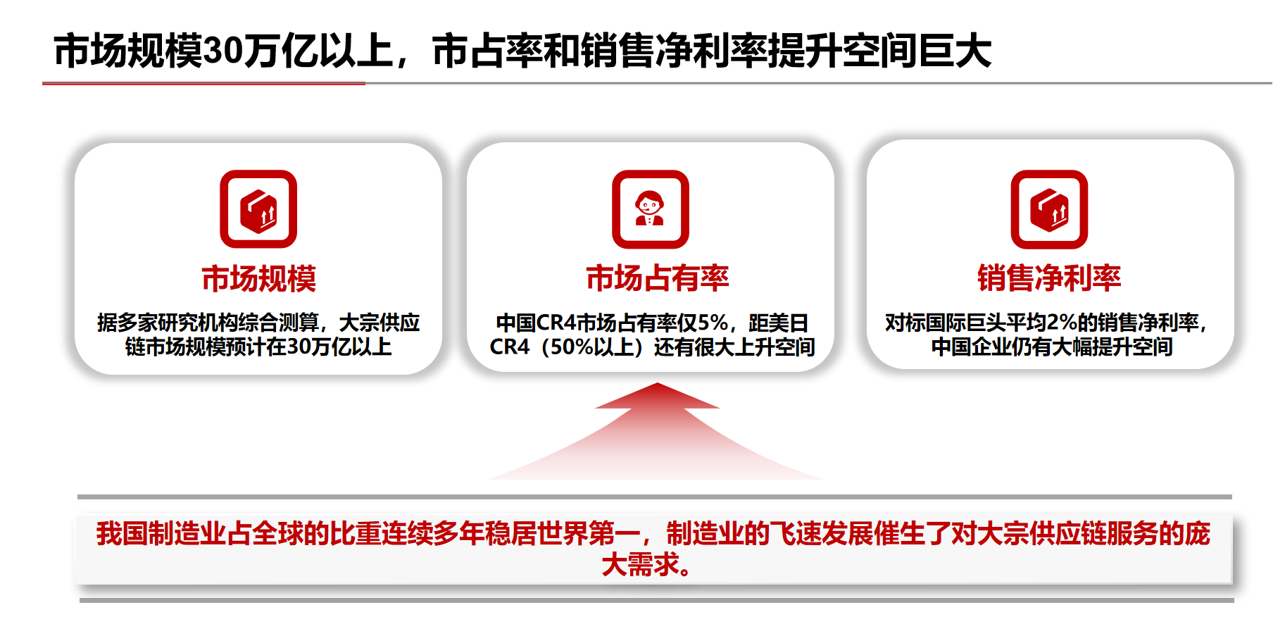 制造業(yè)企業(yè)日益專業(yè)化,對供應(yīng)鏈服務(wù)的需求從簡單追求成本,轉(zhuǎn)變?yōu)楦非笮剩袌鲐叫枘?span style="color: rgb(239, 25, 25); box-sizing: border-box;">提供“一攬子”服務(wù)、具備效率優(yōu)勢的大宗供應(yīng)鏈服務(wù)商。