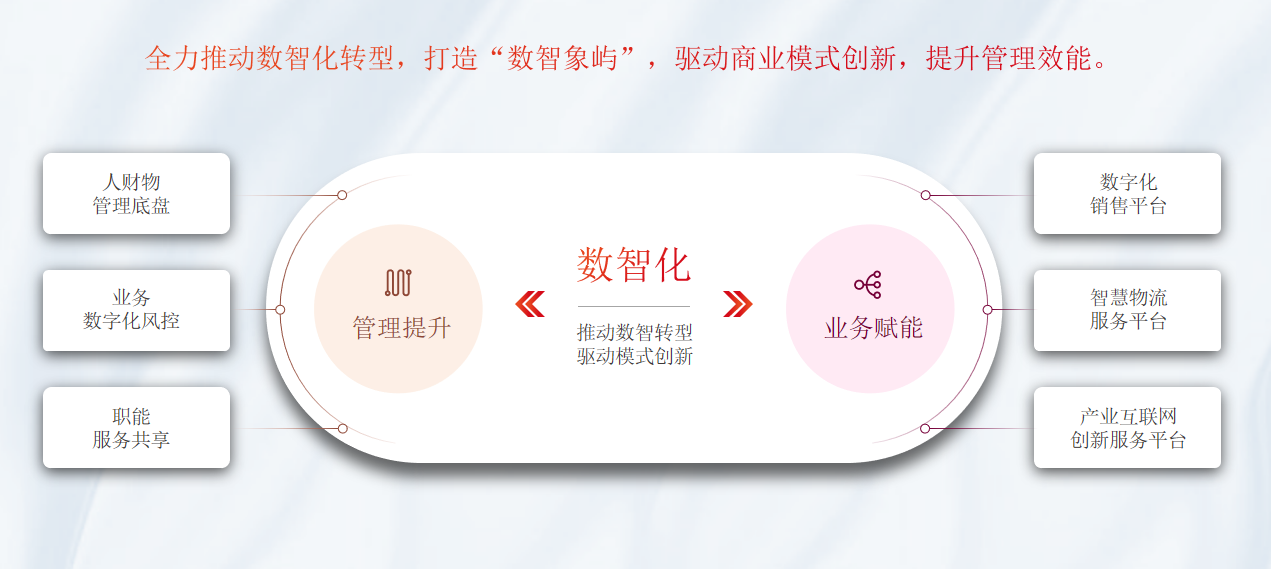 象嶼股份依托海量的業(yè)務(wù)數(shù)據(jù)、龐大的客戶資源、豐富的應(yīng)用場景,積極推進(jìn)數(shù)字化技術(shù)與業(yè)務(wù)的有效融合,并已落地農(nóng)業(yè)產(chǎn)業(yè)級互聯(lián)網(wǎng)平臺、供應(yīng)鏈金融服務(wù)平臺、智慧物流服務(wù)平臺、網(wǎng)絡(luò)貨運(yùn)平臺4大重點(diǎn)項(xiàng)目,實(shí)現(xiàn)技術(shù)及商業(yè)模式升級。