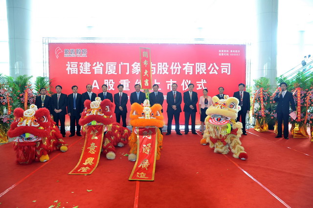 2011年8月29日,福建省廈門象嶼股份有限公司在上海證券交易所舉行隆重的重組上市儀式。廈門市人民政府葉重耕副市長及象嶼股份王龍雛董事長共同敲鑼開盤。象嶼股份股價高開逾1倍,開盤價8.25元,早市最高漲127.5%。截至早市收盤,報8.29元,漲108.29%。